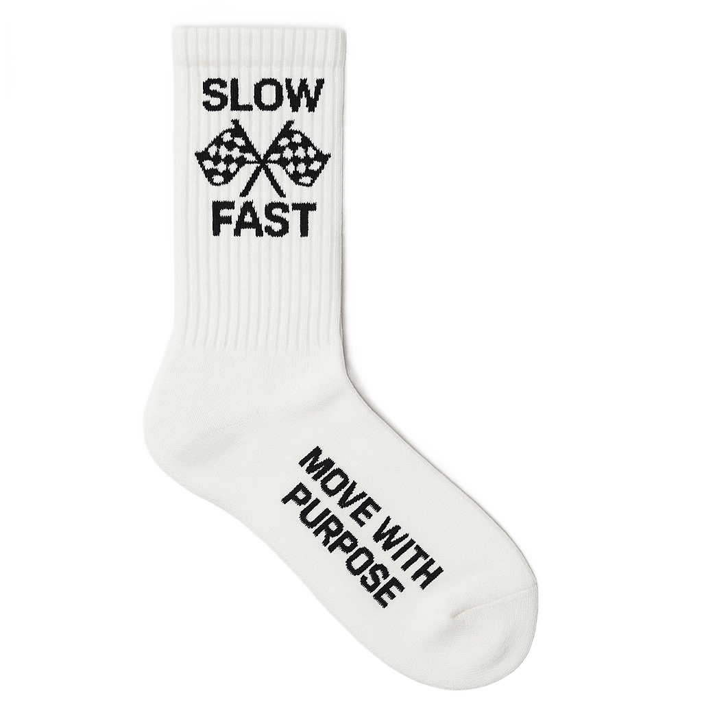 Designed for movement, these premium crew socks combine comfort with cultural statement. Featuring the Slow Or Fast logo with racing flags on the leg and the mantra “Move With Purpose” on the sole, they’re built for everyday wear with a touch of street energy. Soft, durable, and bold—these socks carry the spirit of Tokyo ↔ NYC with every step.